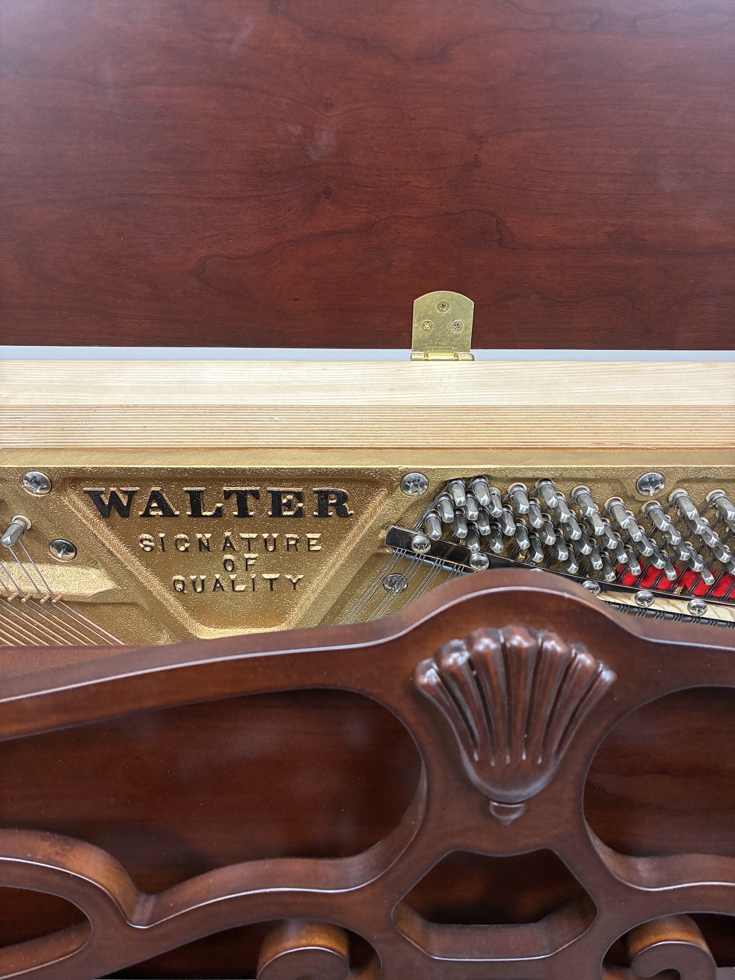 The Queen Anne styling features the graceful curved lines of the cabriole leg enhanced by beautiful shell carvings on both the legs and music desk.