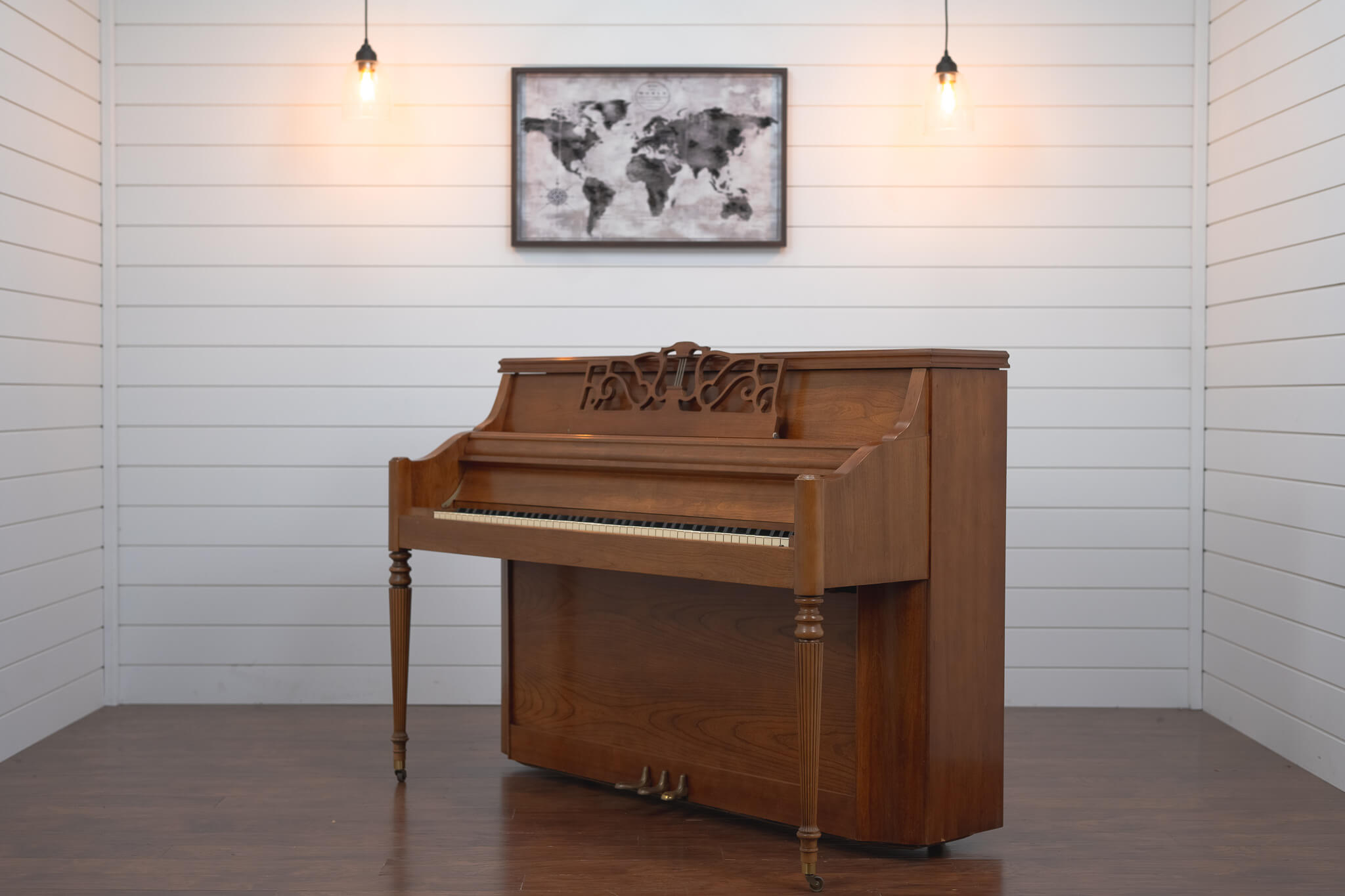 This elegant hand rubbed Walnut Polished Charles R. Walter Traditional upright piano is a rare find! It was handmade in Elkhart Indiana. Lovingly cared for in a private family home. Very nice condition, with minimal imperfections. Has an Excellent feel and a beautiful tone, as a Walter should.