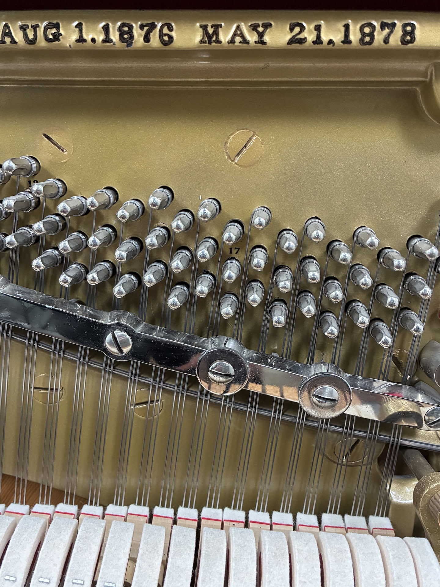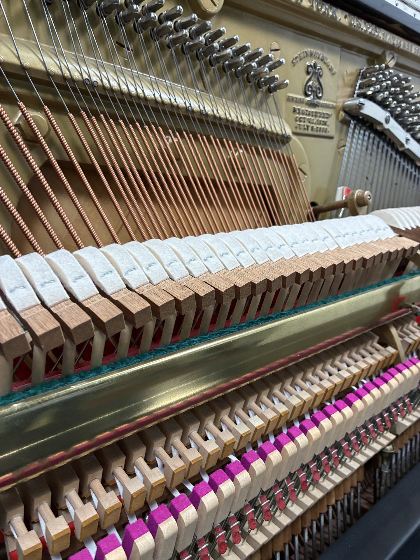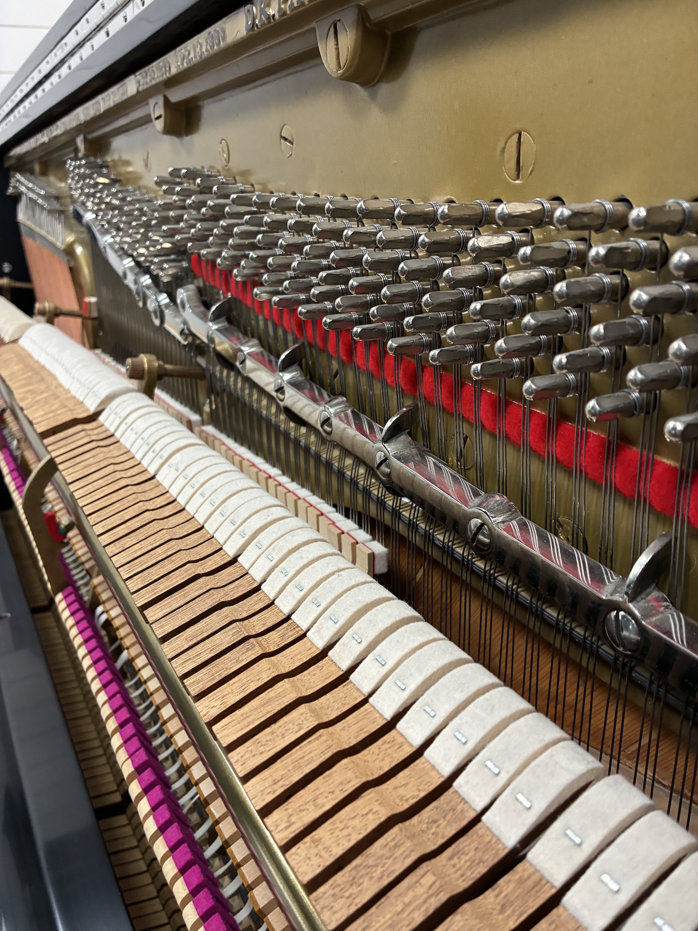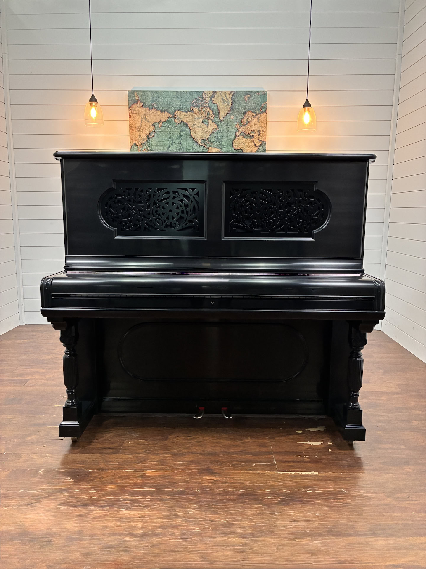 This expertly rebuilt upright piano features a five- and seven-ply American hard rock maple pin plank, nickel-plated tuning pins, and custom Mapes USA–made bass strings for excellent tuning stability and rich tone. The plate has been refinished in a custom color with correct string sizing and serial number decals.
