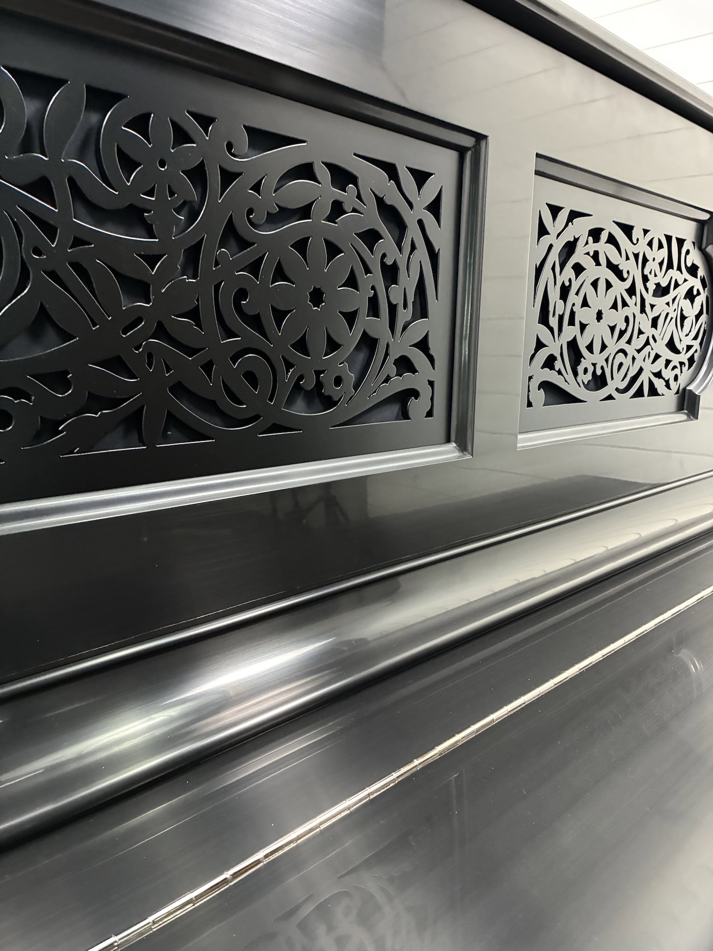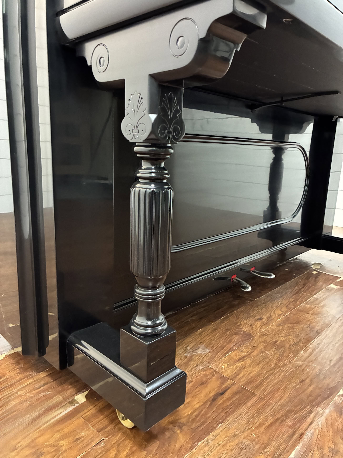The cabinet showcases a beautiful ebony hand-rubbed finish with nickel-plated hardware, all-new casework felts, and a new fallboard decal. Inside, the action has been completely renewed with all new action parts, including new damper levers and felts. The keyboard has been upgraded with new German keytops, sharps, key bushings, and keyframe felts for a smooth, responsive touch.